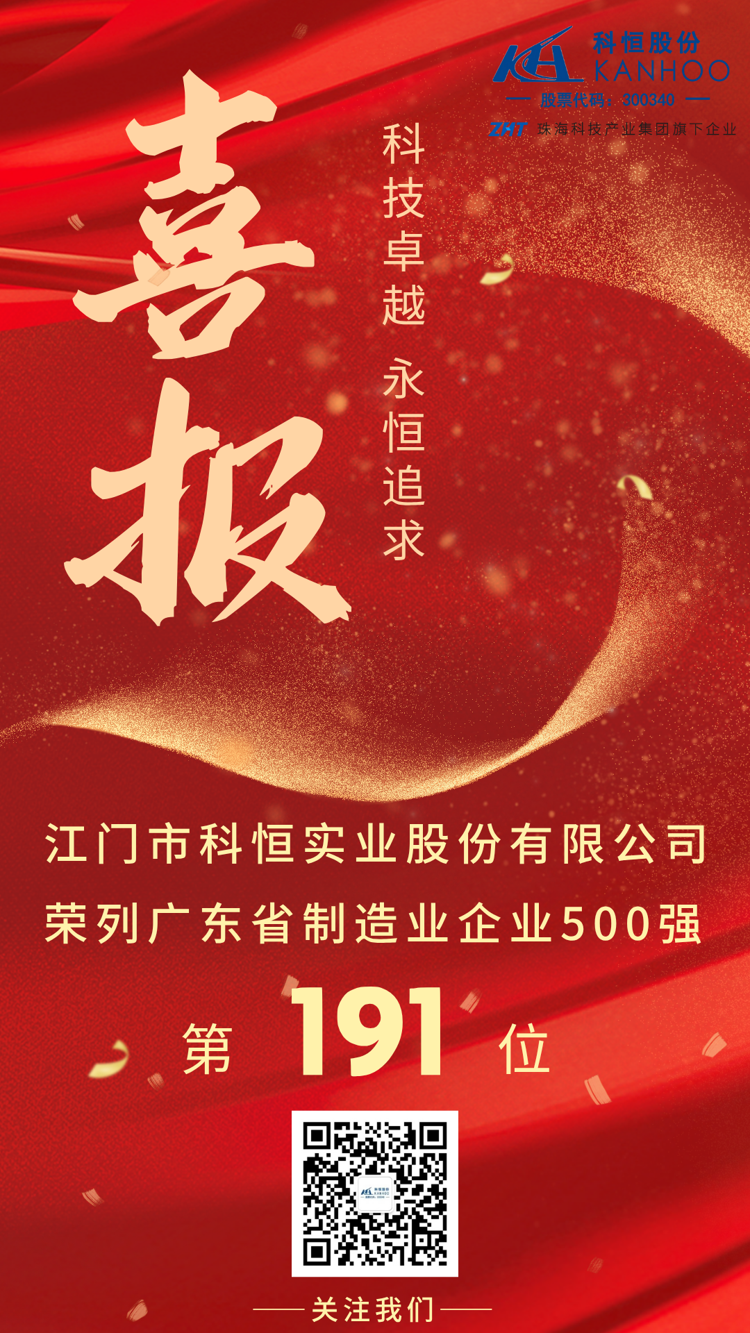 祝賀!江門(mén)市科恒實(shí)業(yè)股份有限公司入選廣東省制造業(yè)500強(qiáng)